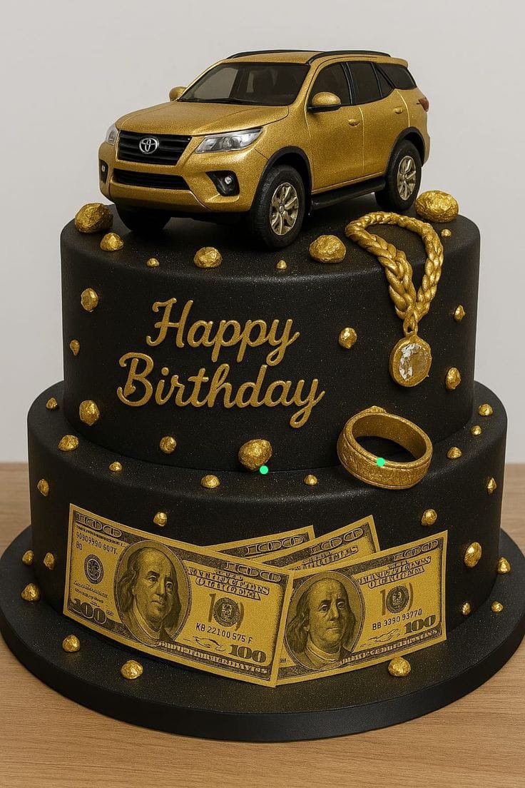 A two-tier matte black birthday cake themed around wealth and luxury, topped with a gold SUV, scattered gold nuggets, and edible $100 bill accents