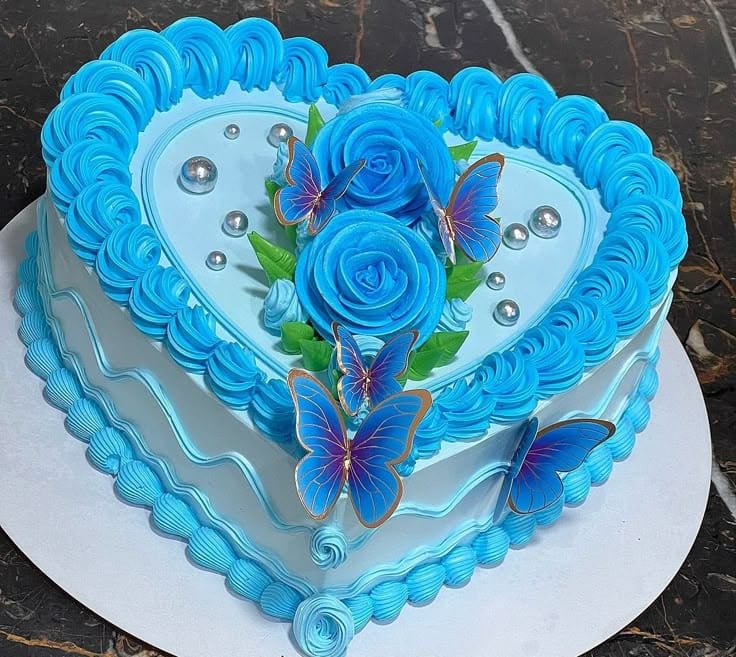 A beautiful blue heart-shaped cake adorned with delicate buttercream roses, ornate blue piping, and shimmering gold and pink butterfly toppers, perfect for a romantic celebration.