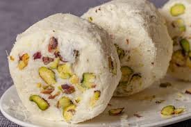 A flaky, layered sweet made from chickpea flour, sugar, and ghee, often pressed into a neat cup or square shape. It has a delicate, airy texture and a rich, nutty sweetness.