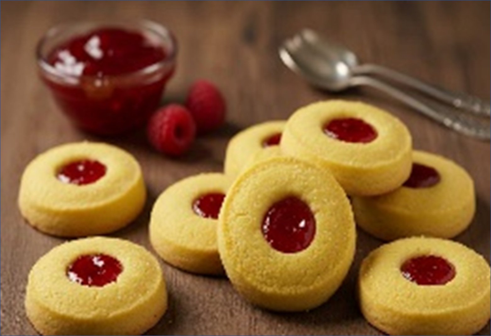 This biscuit is known for its small, round shape and a distinctive center of sweet, brightly colored jam. Its small size and tender crumb make it an excellent choice for a light snack or with your afternoon tea.