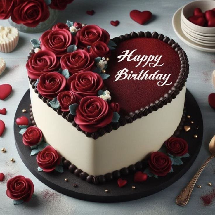 A heart-shaped birthday cake with smooth white sides and a deep red top. A lush cluster of dark red roses covers the left side, while 'Happy Birthday' is written in elegant white script on the right, framed by a dark piped border
