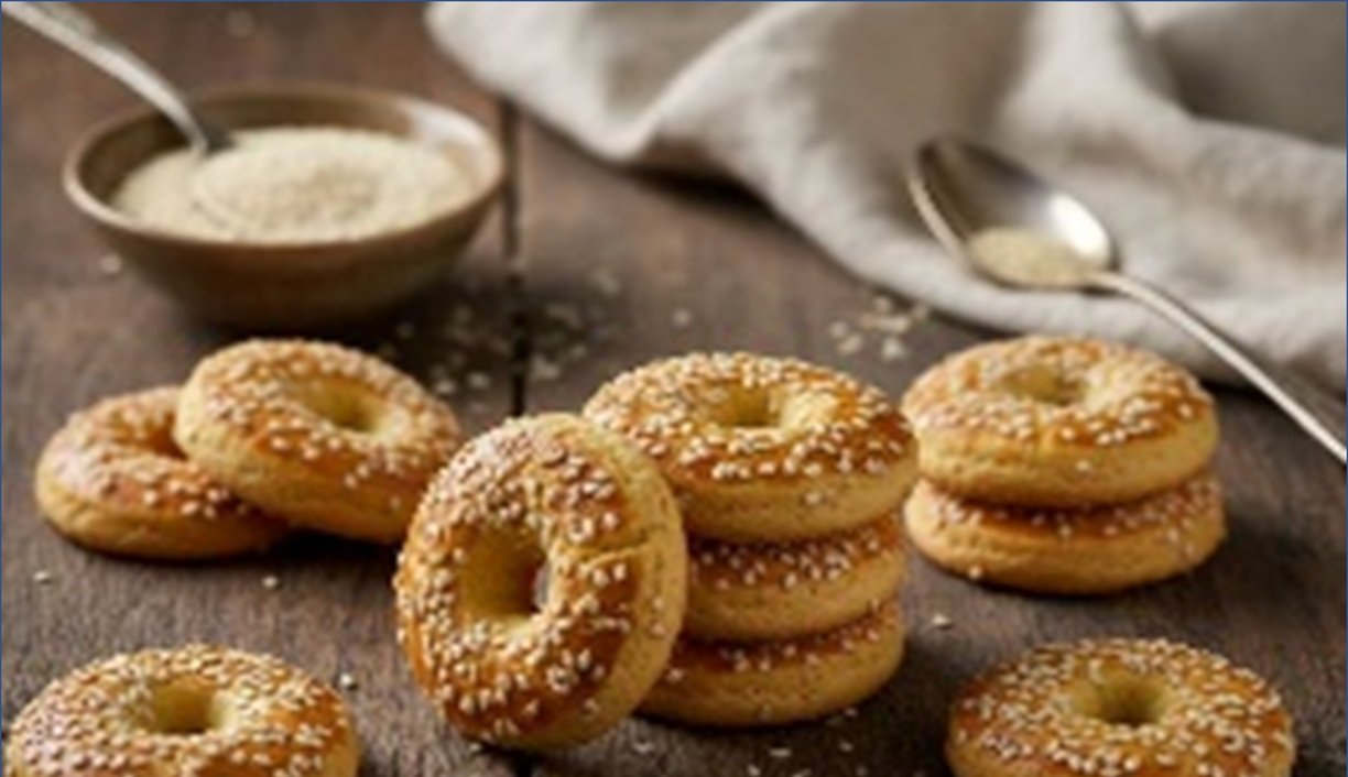 A ring-shaped biscuit generously coated in sesame seeds (til) for an added layer of flavor and crunch. This biscuit is both appealing to the eye and satisfying to the palate with its light sweetness.